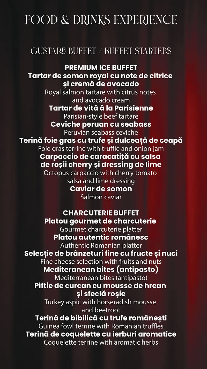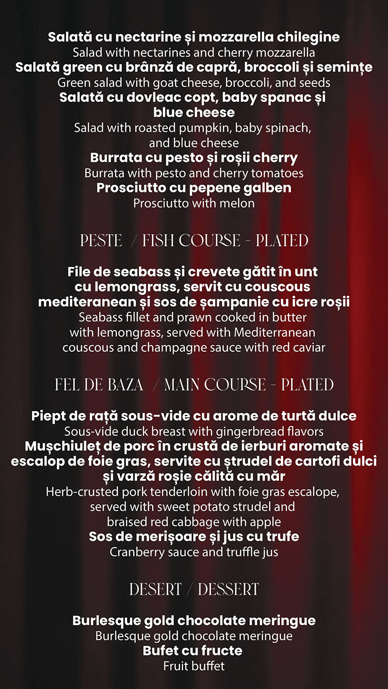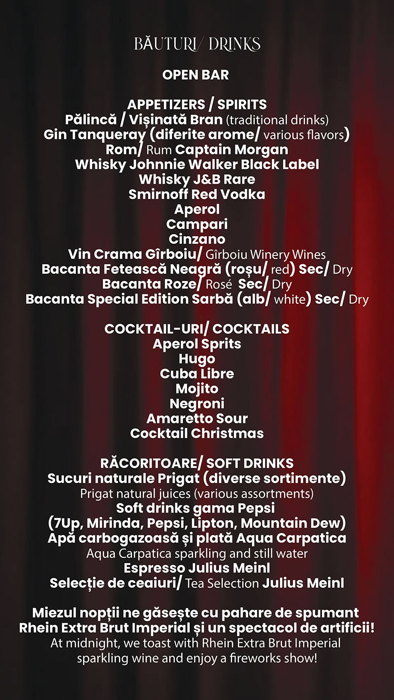 Meniu festiv & open bar. Savurează preparate rafinate, băuturi premium și combinații culinare inspirate, pregătite special pentru cea mai așteptată noapte a anului.